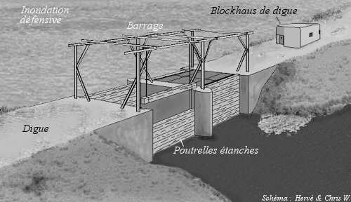 La région de la Sarre a été fortifiée tardivement (de 1935 à 1940) et d'une manière particulière. Le secteur, riche en étangs, verra sa défense s'organiser en zones d'inondations défensives, alimentées par de grands réservoirs. Ces vallées innondables seront délimitées par les digues et les barrages. Un blockhaus de digue sera construit pour défendre chaque barrage.